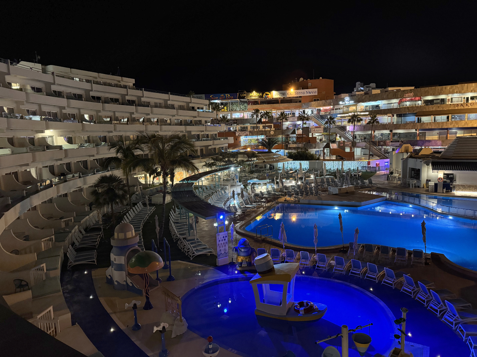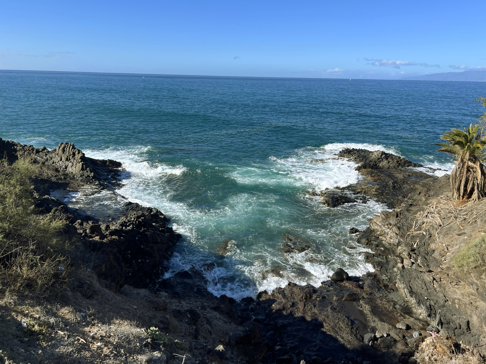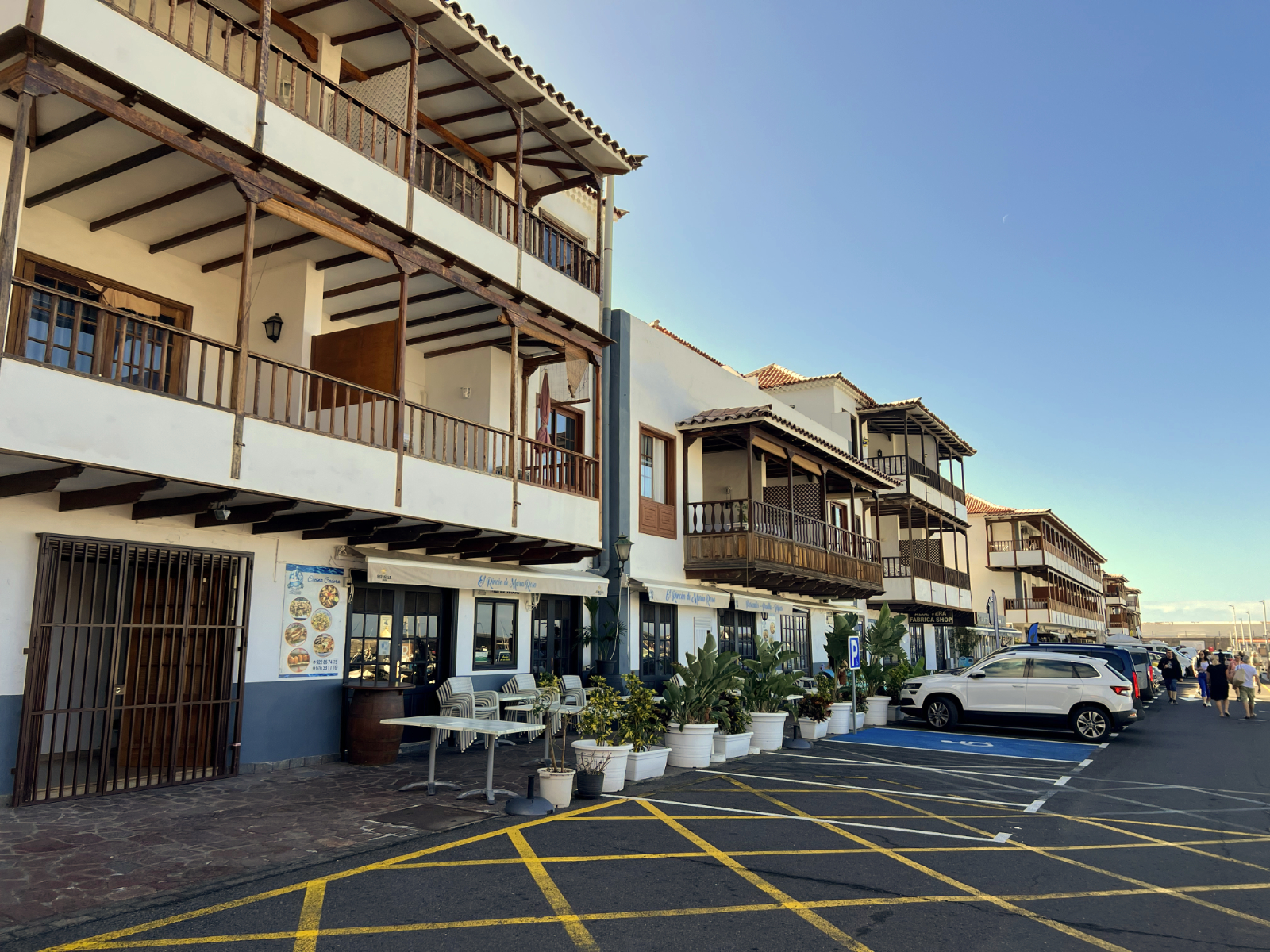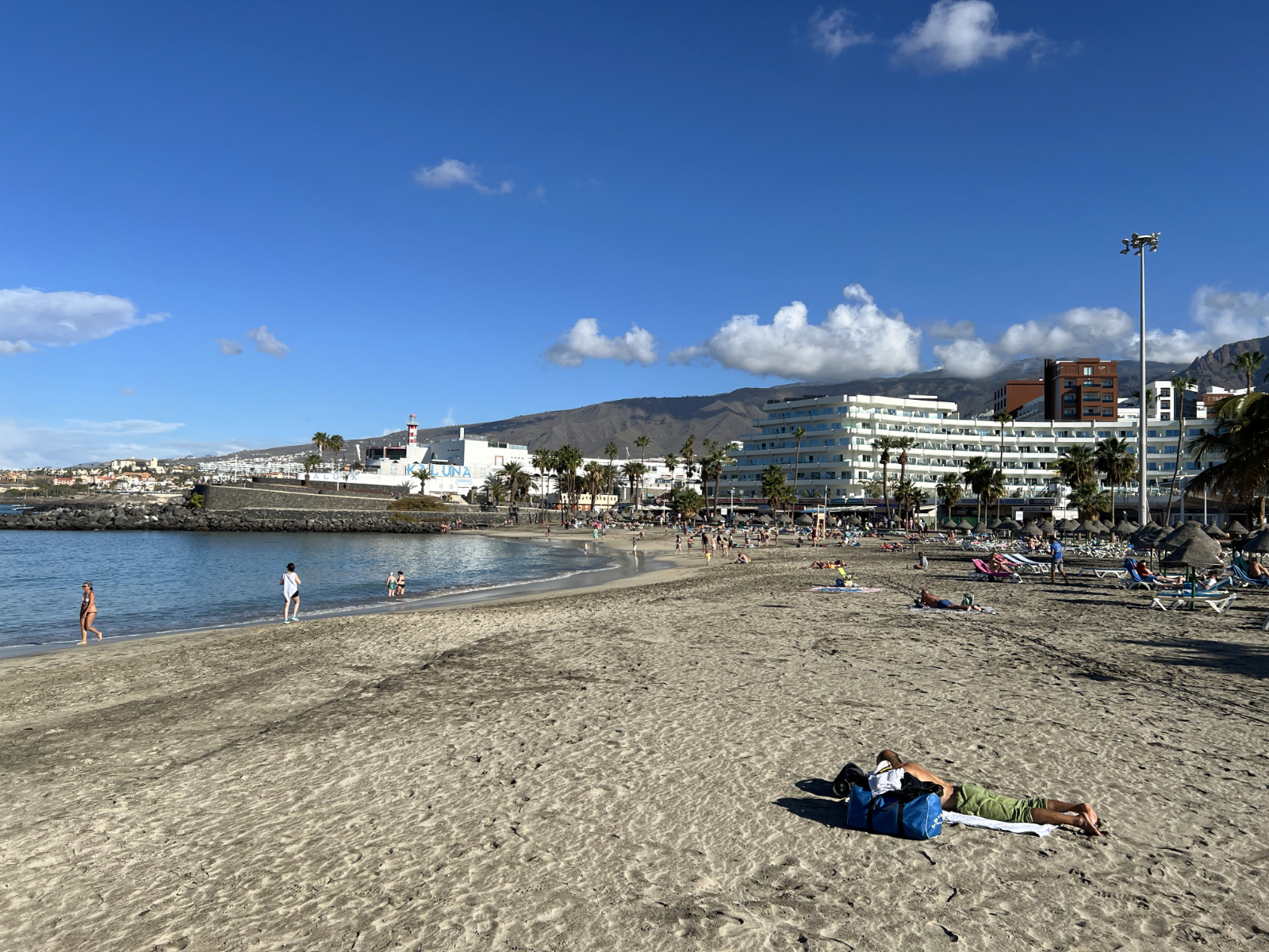 Za naših sedem dni bivanja smo si izbrali družinski hotel Hovima La Pinta, ki se nahaja ob istoimenski plaži, s storitvijo polpenziona, kar nam najbolj ustreza, saj smo med zajtrkom in večerjo večinoma hodili na izlete. Prvi dan, v četrtek, pa smo se vseeno odločili, da najprej raziščemo bližnjo okolico in izkoristimo peščeno plažo pred hotelom. Samopostrežni zajtrk je ponujal dovolj izbire okusne hrane, da tudi z otroci ni bilo težav. Tako smo lahko po zajtrku že hodili po obalni pešpoti, ki gre vse od Costa Adeje na severozahodu, mimo našega hotela do Los Cristianos na jugovzhodu. To je turistično najbolj razvito območje na otoku, prava betonska džungla apartmajskih kompleksov, hotelov, trgovin in lokalov na sicer najbolj suhem delu otoka, tako rekoč brez zelenih površin. Turizem se je na tem delu otoka začel že v petdesetih letih prejšnjega stoletja, ko so sem na rehabilitacijo začeli hoditi bolni Švedi in kasneje tudi drugi Evropejci, največja rast pa se je začela po letu 1978, ko so zgradili letališče na južnem delu otoka. In kljub stalnim prenovam se starost turističnega naselja kaže na vseh korakih, od starih blokov in hotelov, do lokalov z enako ponudbo, kot pred desetletji in trgovin s poceni kitajsko robo. Območje nam tako ni bilo nič kaj zanimivo, izbrali smo ga predvsem zaradi lege ob plaži, kjer smo preživeli popoldne. Temperatura zraka okrog dvajset stopinj, brezvetrje in sonce res dobro dene v januarju. Tudi morje ni bilo mrzlo in s temperaturo okrog 20 stopinj ravno tako primerno za kopanje. Plaža je sicer umetna, nasuta z afriškim peskom in z velikimi valobrani, a vseeno je kopanje v morju pozimi res nekaj posebnega. Dan je hitro minil in ob šestih smo bili že v hotelu na večerji. Pred spanjem smo naredili še en sprehod po obalni poti, dopoldne smo se obrnili proti Playa de las Americas, zvečer pa proti Costa Adeje. Neke razlike ni bilo, hoteli, trgovine, gostilne in lokali. Predvsem pa veliko starejših turistov.