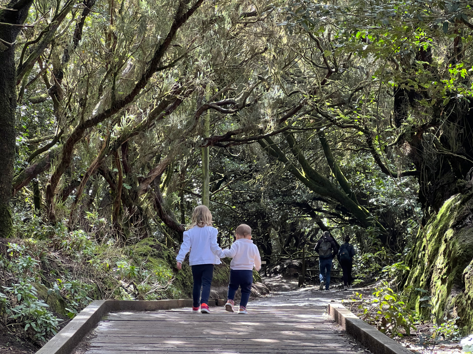 V soboto smo se odpravili v naravni park Anaga na severovzhodu otoka. Gre za gorsko območje do najvišje višine 1000 m in je najstarejši del otoka, ki se je formiral pred osmimi milijoni let kot del vulkana in je danes prekrit večinoma z lovorjevim gozdom. Vožnje do prvega postajališča v parku je bilo dobro uro, cesta pa je vodila mimo glavnega mesta Santa Cruz in drugega največjega mesta na otoku, San Cristobal de la Laguna. Že okoli glavnega mesta je pokrajina postala občutno bolj zelena, najlepši del poti pa je bil od vstopa v park naprej, kjer se je začel gost zimzeleni gozd. Pravo nasprotje suhega in puščavnega juga. Cilj nam je bila peš pot Sendero de los Sentidos (čutna pot), edina izmed mnogih pešpoti v parku, ki je primerna tudi za vozičke. Do same poti z avtom sicer nismo mogli, saj je bilo parkirišče polno, tako da smo morali parkirati kak kilometer stran. Na srečo je bila ob začetku poti še restavracija, kjer smo se okrepčali s sendvičem, rogljičkom in kavo. Vozičku primernih je bilo samo kakšnih 100 metrov poti, pa še ta del sta obe punci prehodili sami, a smo vseeno uživali v prijetnem in vlažnem gozdnem okolju. Tudi temperatura je bila kakšnih pet stopinj nižja, kot na jugu. Preostanek parka smo si ogledali kar iz avta ter na številnih razglednih točkah, ki so dobro označene in imajo možnost parkiranja. Žal z majhnimi otroci drugače ne gre (sploh če ne želijo biti v otroškem nahrbtniku), vseeno pa je bila cesta slikovita, razgledi pa prečudoviti. Cesta pelje krožno čez park in pozno popoldne smo se pri San Andresu spustili do morja in se nato skozi glavno mesto vrnili nazaj v naš hotel ravno prav za večerjo.